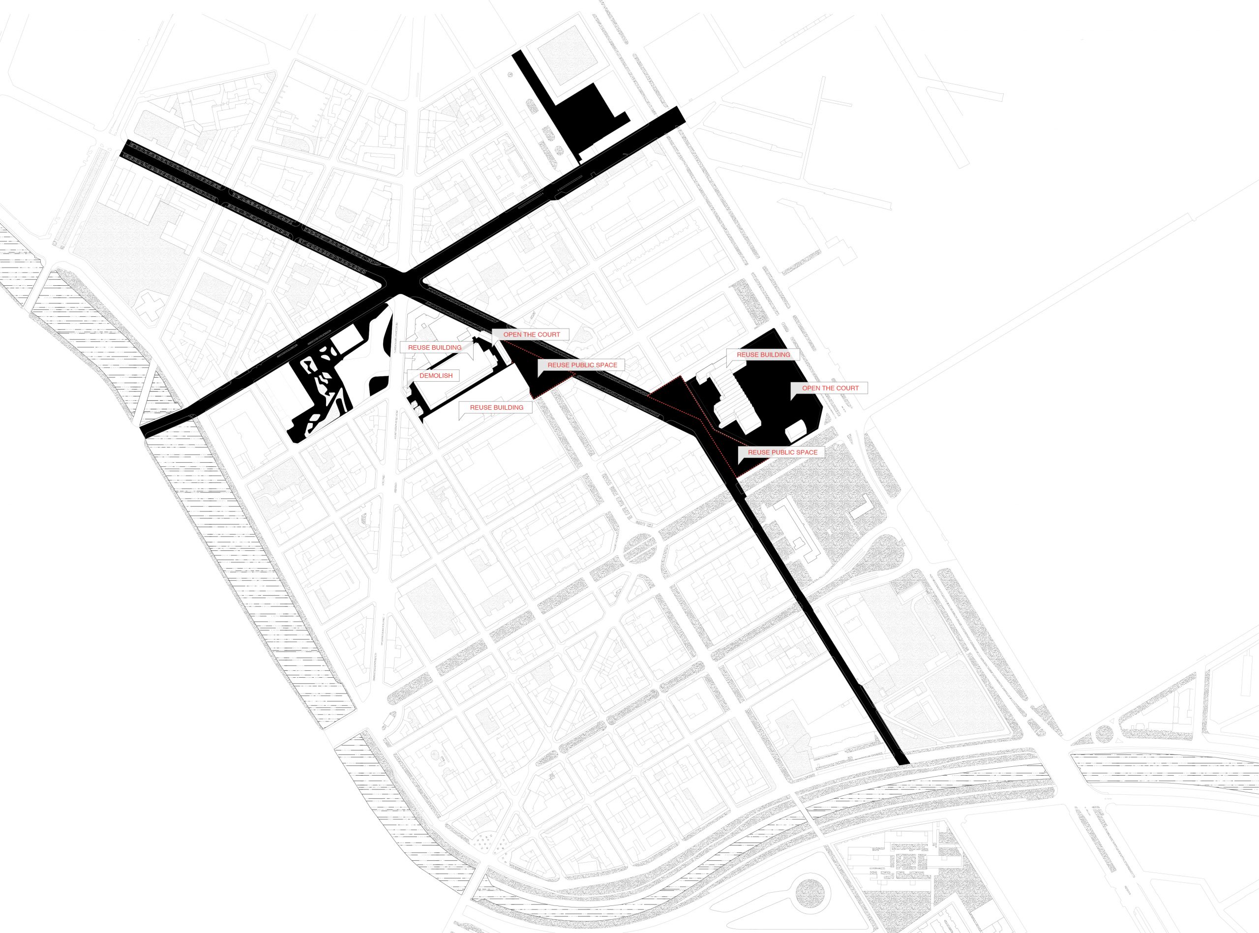 The Nuvola Lavazza block, a reconvertion of part of a former power plant made by architect Cino Zucchi, was identified as a significative example for the remployment of industrial voids.The dimension of these blocks is coexistent with massive road axes, which are oversized in comparison to the services present in the area. These roads are not frequently employed by the public especially due to the abandoned infrastructures.