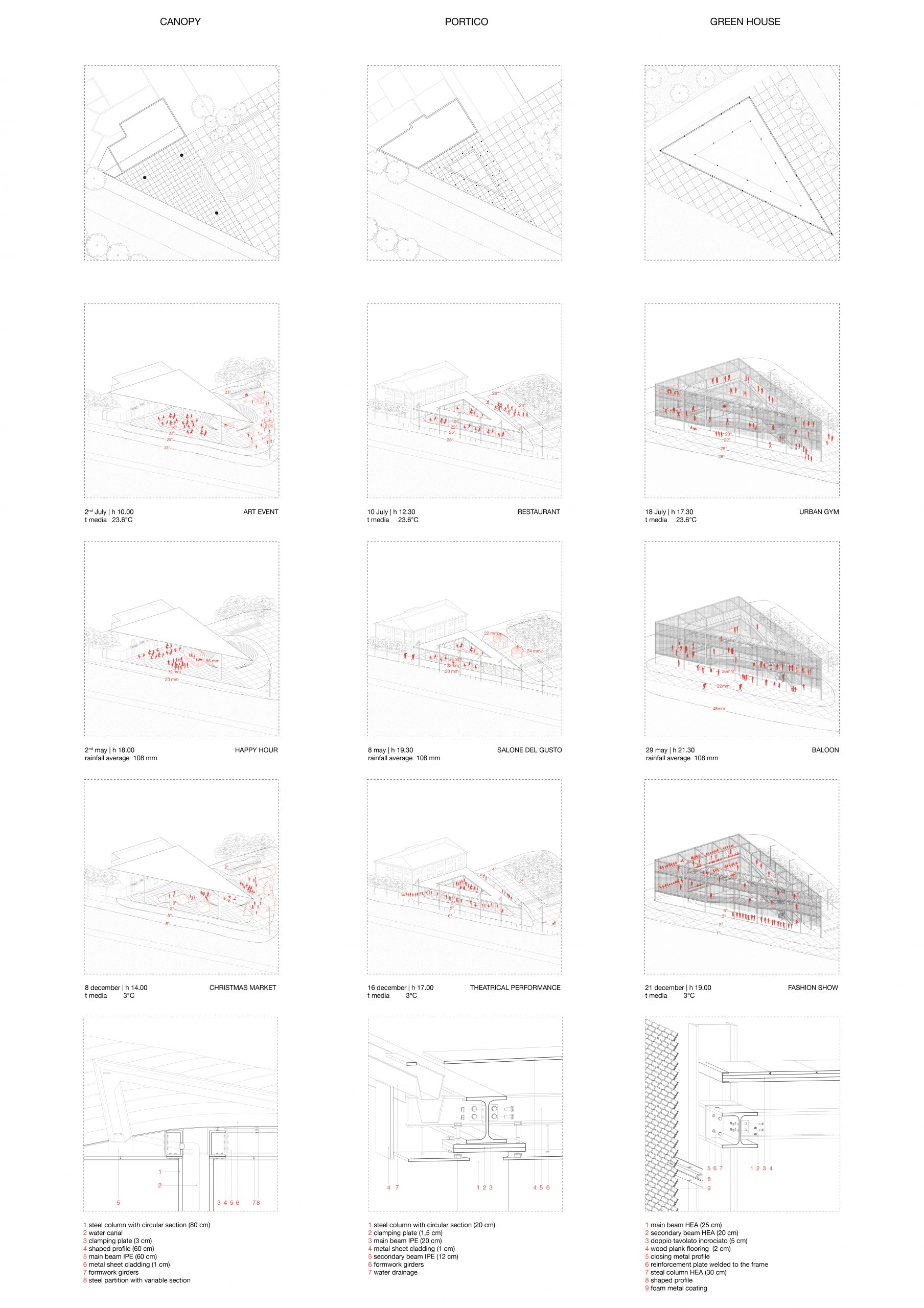 The focus of the project was to reuse these spaces by implementing three climate device we projected: the Canopy, the porticato and the Green House; in order to solve the current climate issues that hit the city of Turin.