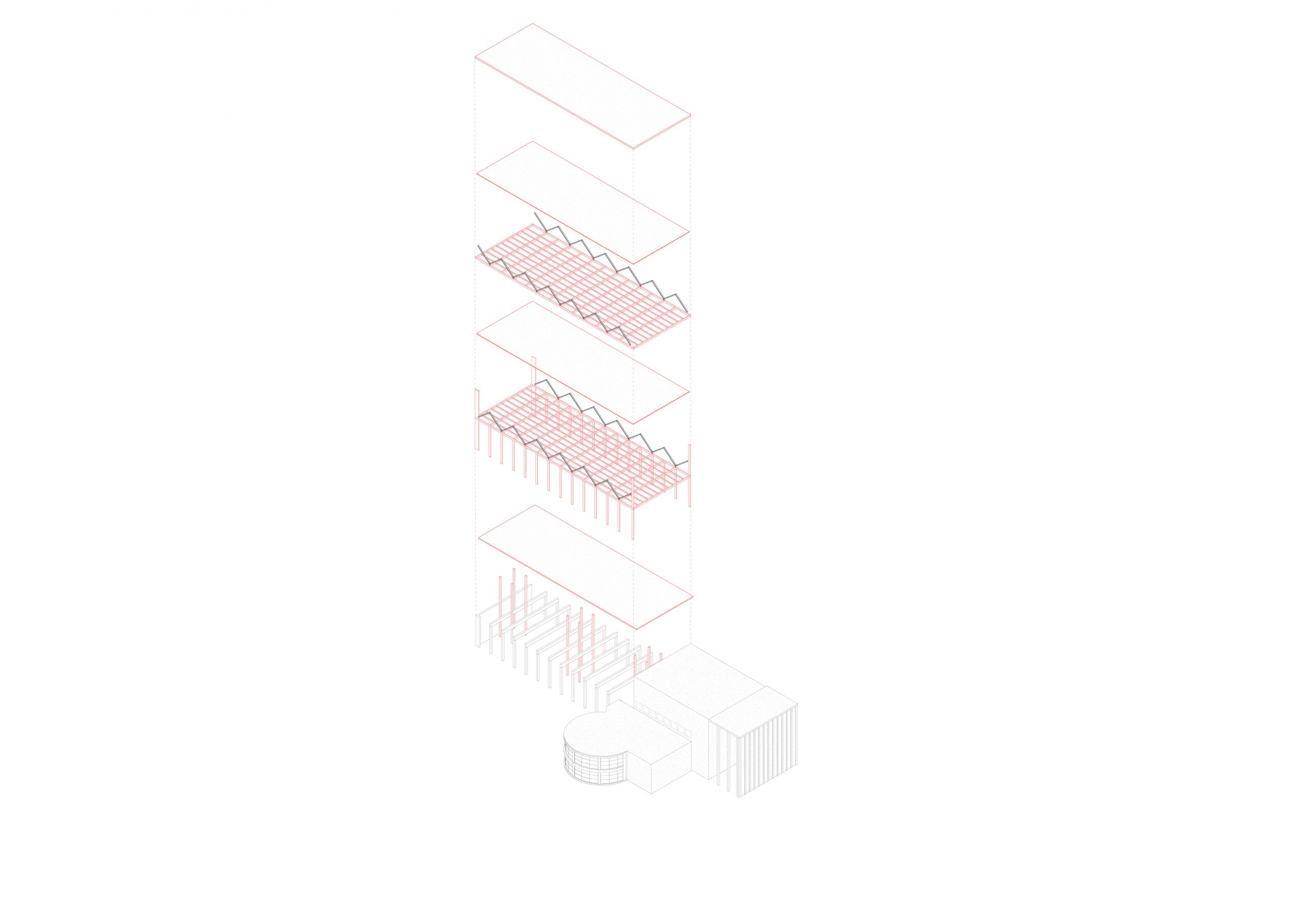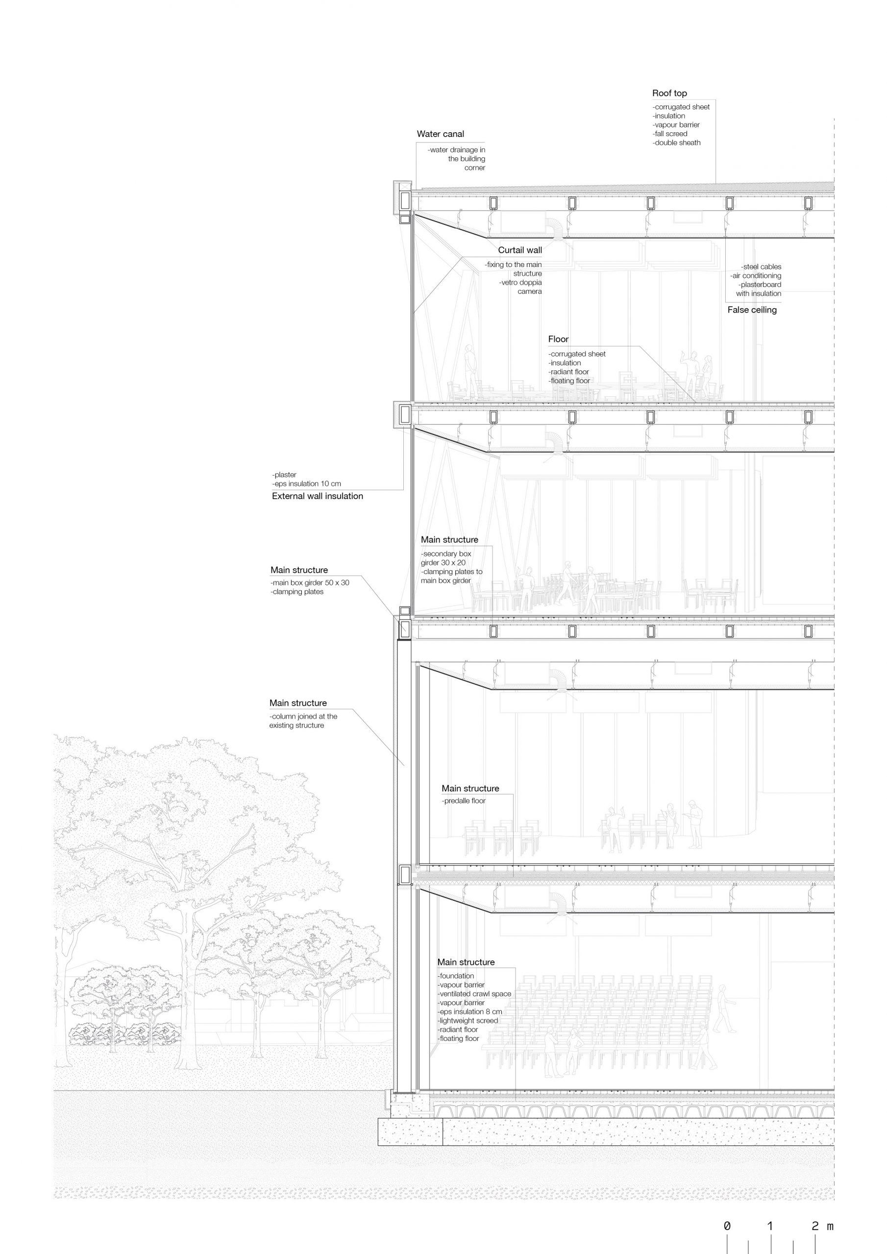 Meanwhile in the rest of the building the original functions are restored as a flexible exposition space and theatre.
